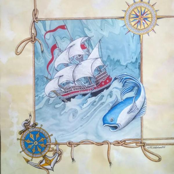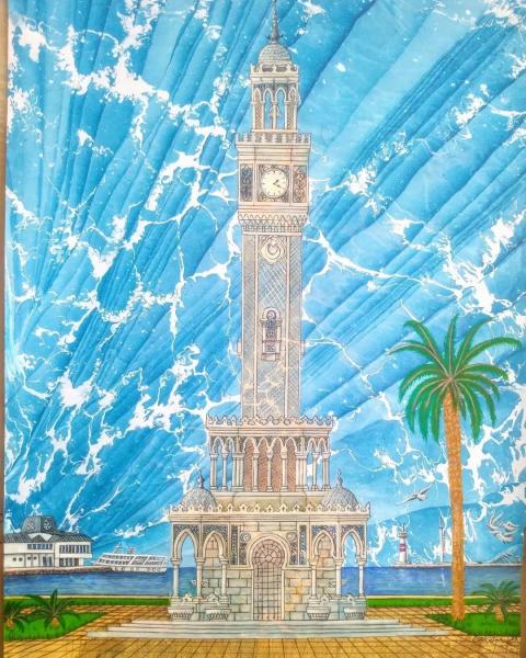 Ebru üzerine İzmir saat kulesi